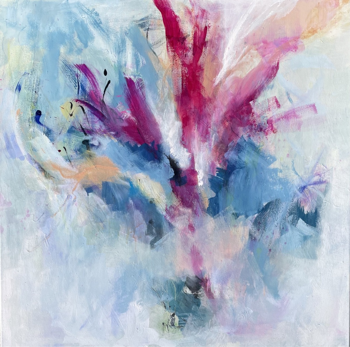 Nach einer mehrschichtigen, lebendigen, schimmernden Untermalung setzt sie je nach Bild das Sujet darauf, das die Künstlerin dann mit dem Hintergrund verbindet und zu einem