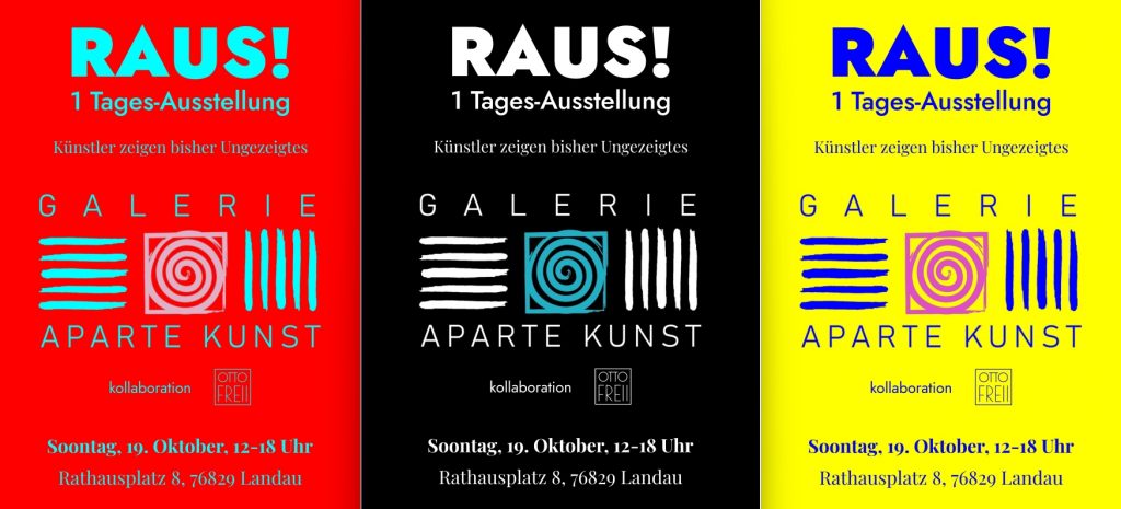 Am verkaufsoffenen Sonntag, den 19. Oktober, verwandelt sich die Galerie Aparte Kunst in Landau in einen ganz besonderen Schauplatz. Unter dem Titel „Raus“ zeigen Künstlerinnen und Künstler Werke, die im klassischen Ausstellungsbetrieb selten zu sehen sind: angefangene Arbeiten, misslungene Versuche, Entwürfe, ältere Projekte und Ideen, die der Künstler selbst nie für vollendet hielt.